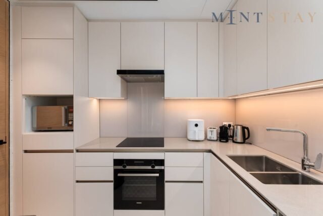 The bright living area leads out to a balcony with a beautiful sea view. Unwind on the couch, catch up on your favorite Netflix shows, or just enjoy the view. If you’re in the mood to cook, the fully stocked kitchen has all the essentials. After you’ve enjoyed your meal at the sleek dining table, you can load everything into the dishwasher. The apartment also features a washing machine and fast Wi-Fi to keep you connected.